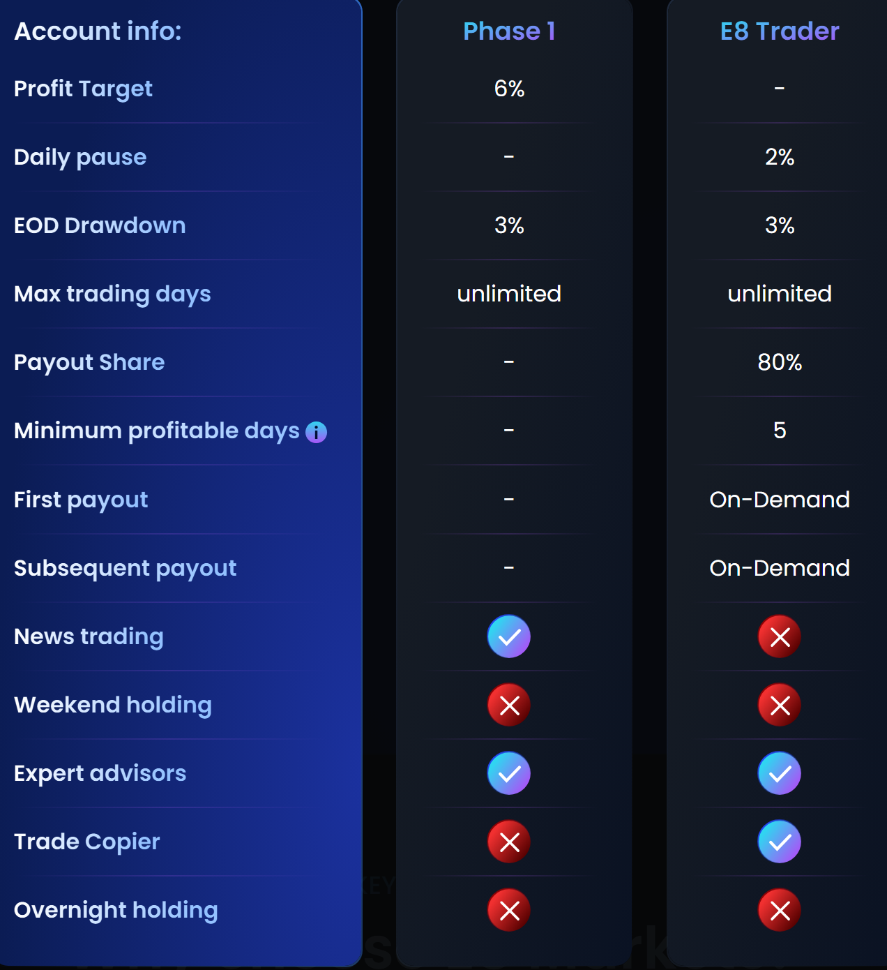 ( tuy nhiên xét về quy tắc payouts thì E8 signature lại khó hơn một chút so với E8 One )