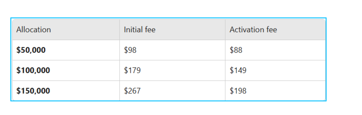 Các kích thước tài khoản 1-Step và mức phí niêm yết tương ứng, bạn xem bảng sau: