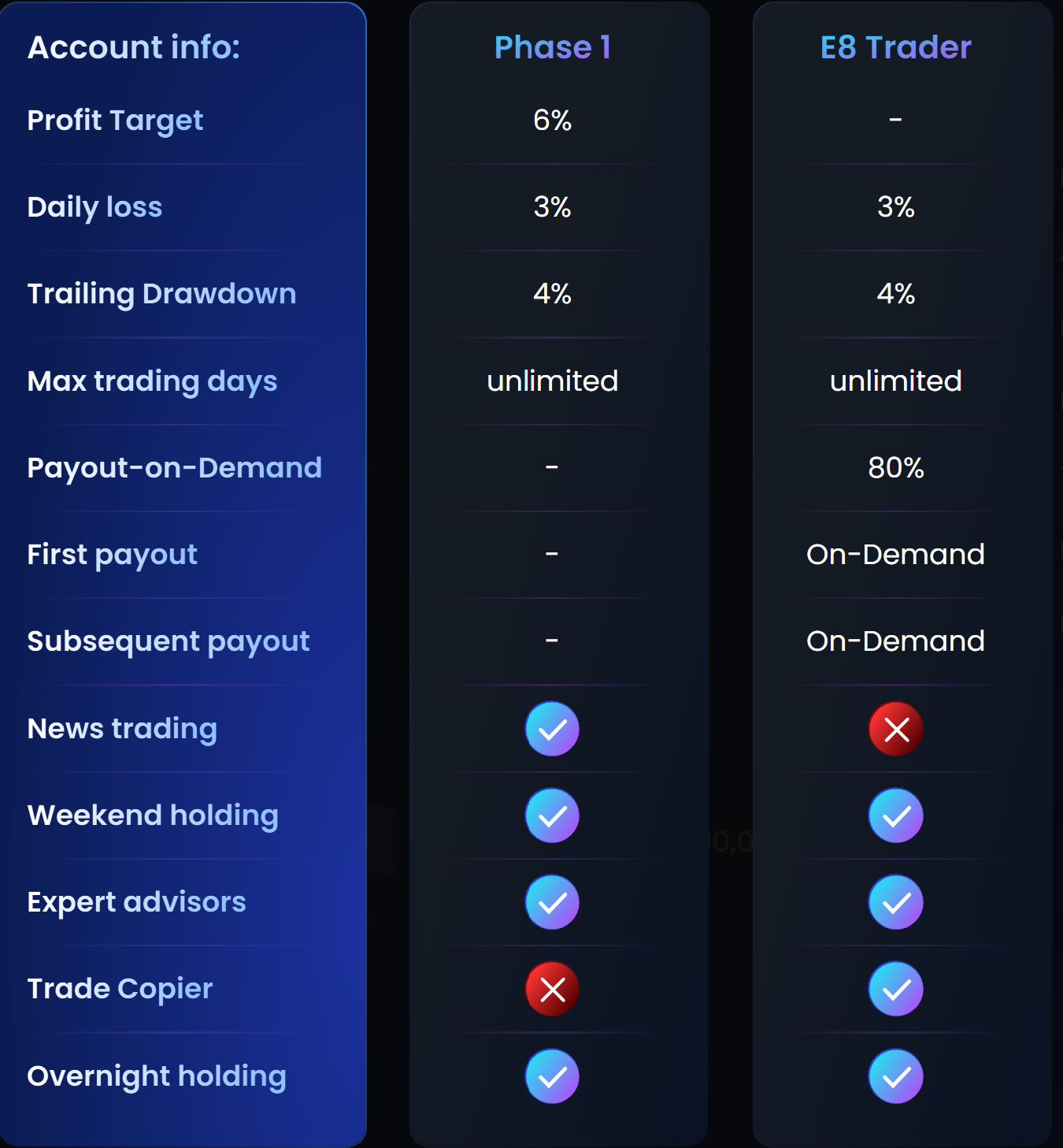 tài khoản E8 One, bạn có thể tùy chọn mức giới hạn sụt giảm tài khoản từ 4% đến 14% và có thể sử dụng nhiều nền tảng giao dịch,