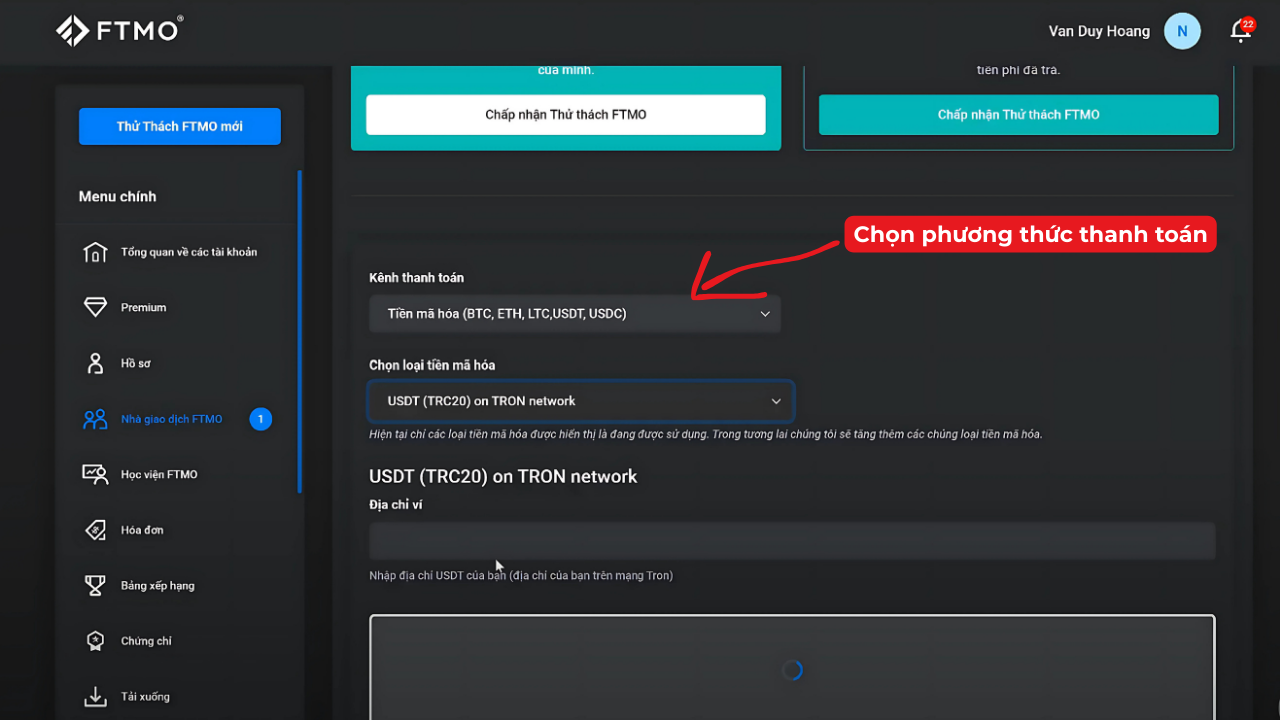 FTMO hỗ trợ nhiều phương thức thanh toán an toàn. Bạn cần chọn một phương thức phù hợp: