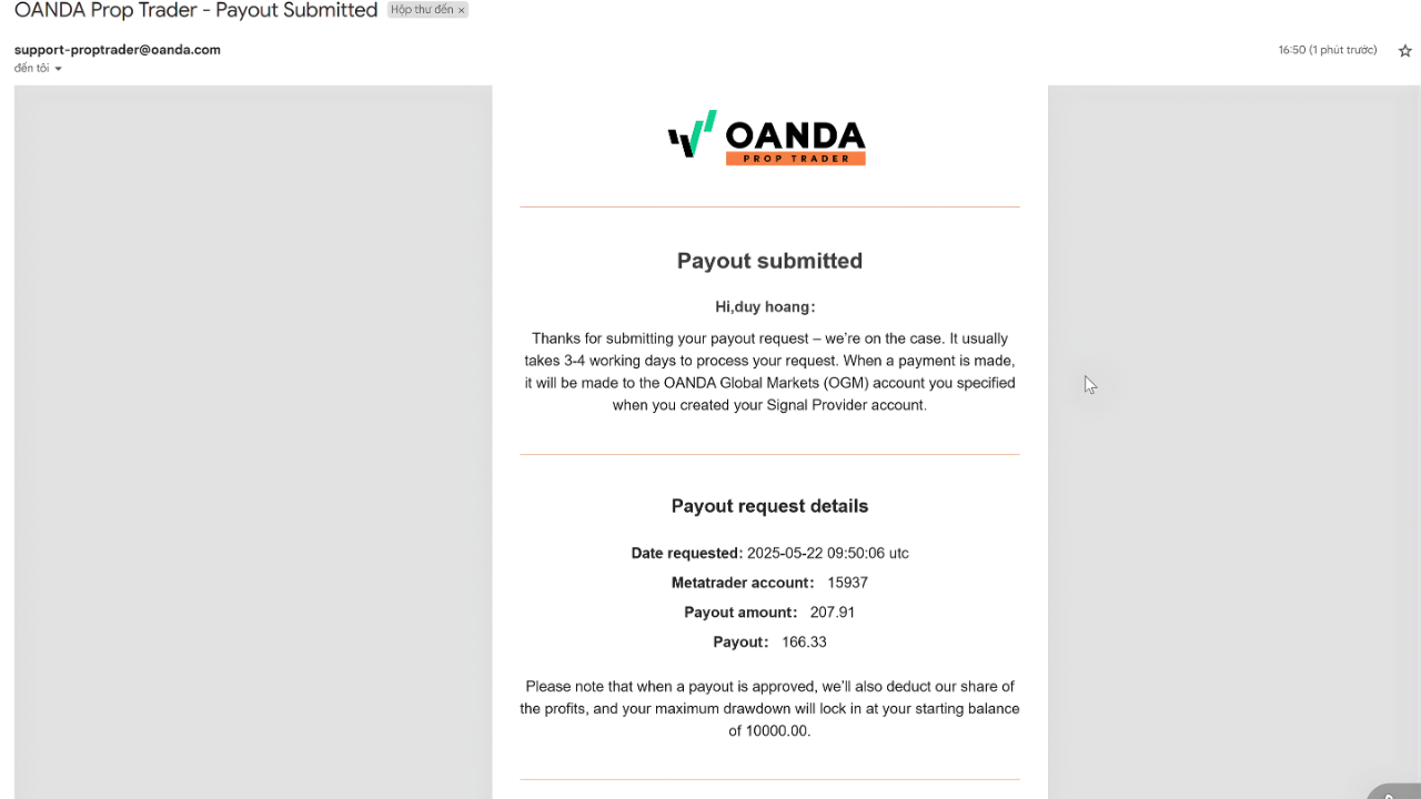 Mặc dù payout hơi lâu chút, nhưng hiện tại OADNA vẫn payout oke và ổn. rất nhiều trader Vietnam hiện tại thực hiện payout tại oanda từ 200$-300$ tới 5k$ -10k$ cũng có
