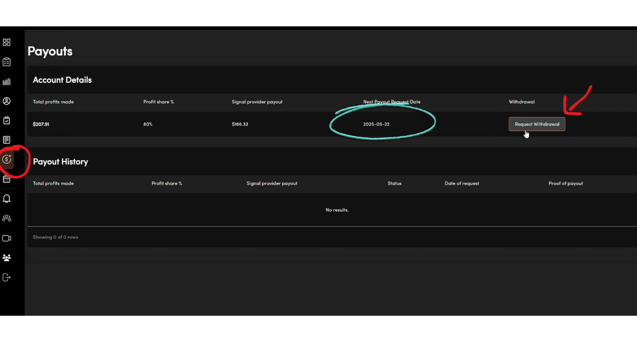 Tại quỹ OANDA sẽ hiện thị rõ ràng ngày có thể thực hiện rút tiền .Nên Ad nghĩ các bạn sẽ không bị quên đâu , đến ngày đó chữ Request withdrawal sẽ sáng lên ,Click để thực hiện rút.