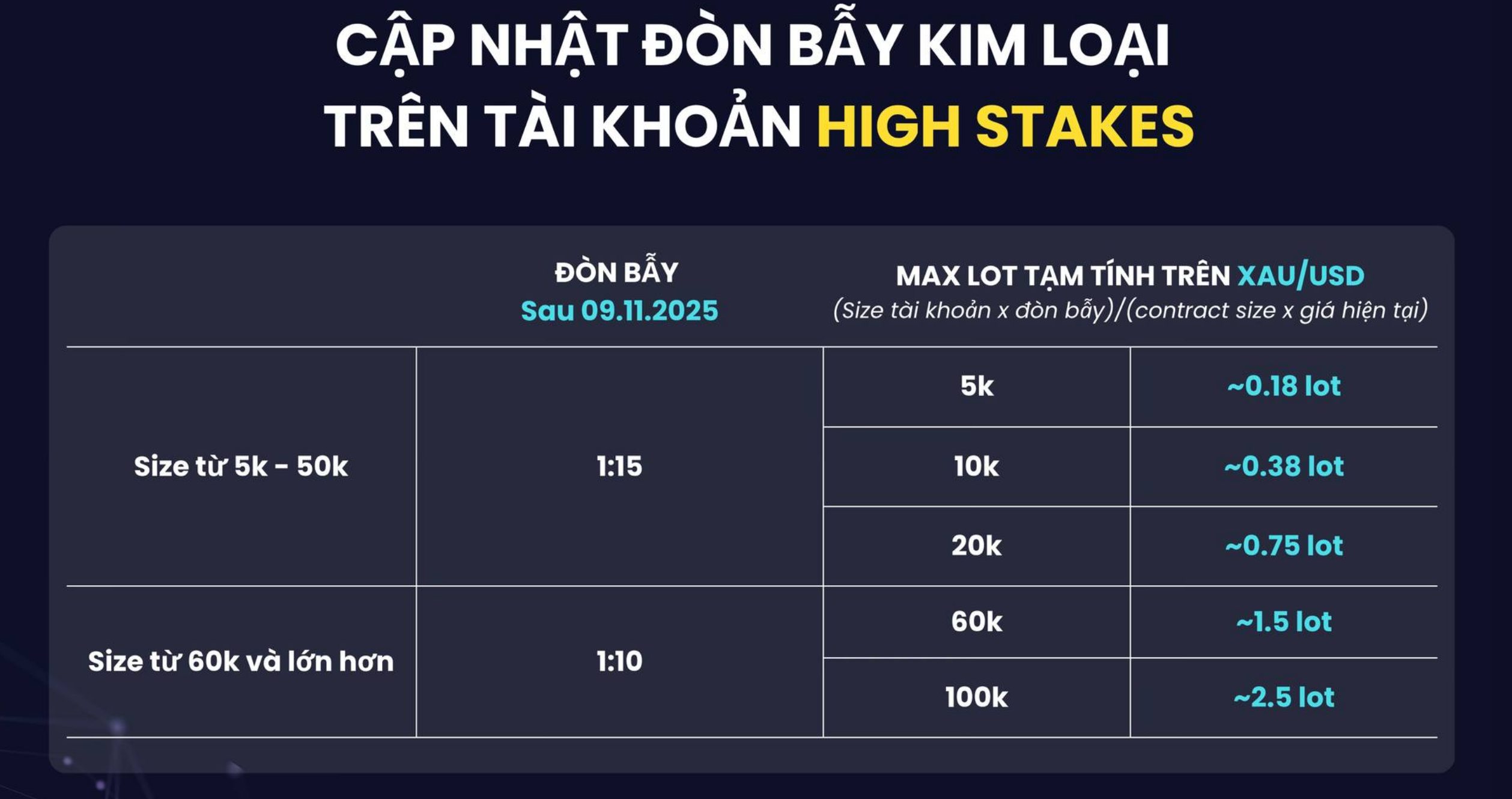 - Số lượng tài khoản tối đa: Mỗi trader được phép có tối đa 3 tài khoản High-Stakes (01 tài khoản $5k, 01 tài khoản $20k hoặc 10k$, 01 tài khoản $60k hoặc $100k).