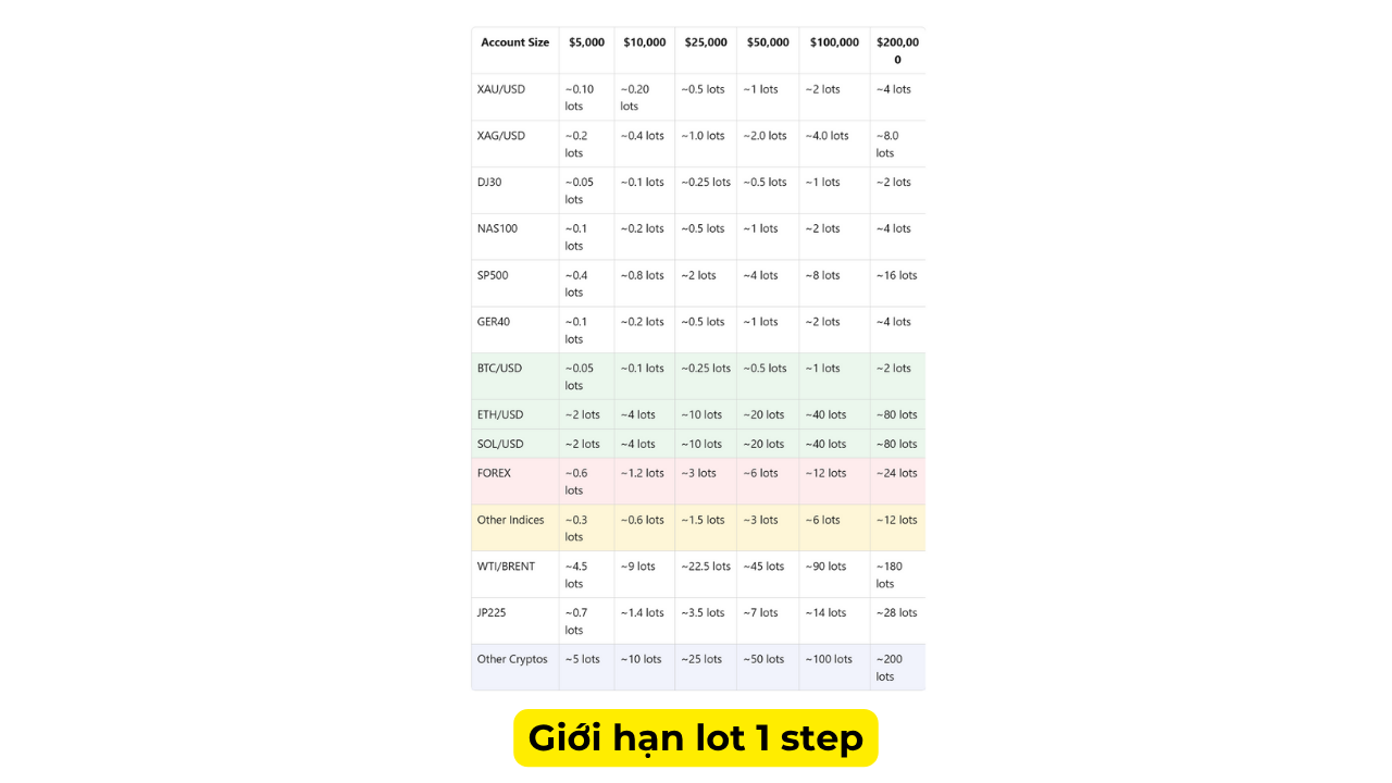 Quy mô tài khoản | Phí tham gia (một lần) | Mục tiêu lợi nhuận | Thua lỗ tối đa | Thua lỗ tối đa trong ngày |