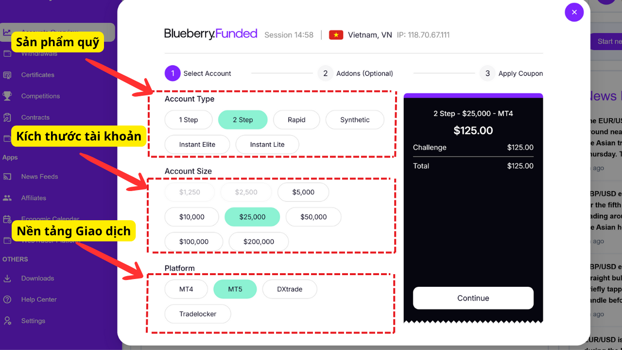Bước 3 : Chọn loại tài khoản bạn sẽ thi và kích thước tài khoản