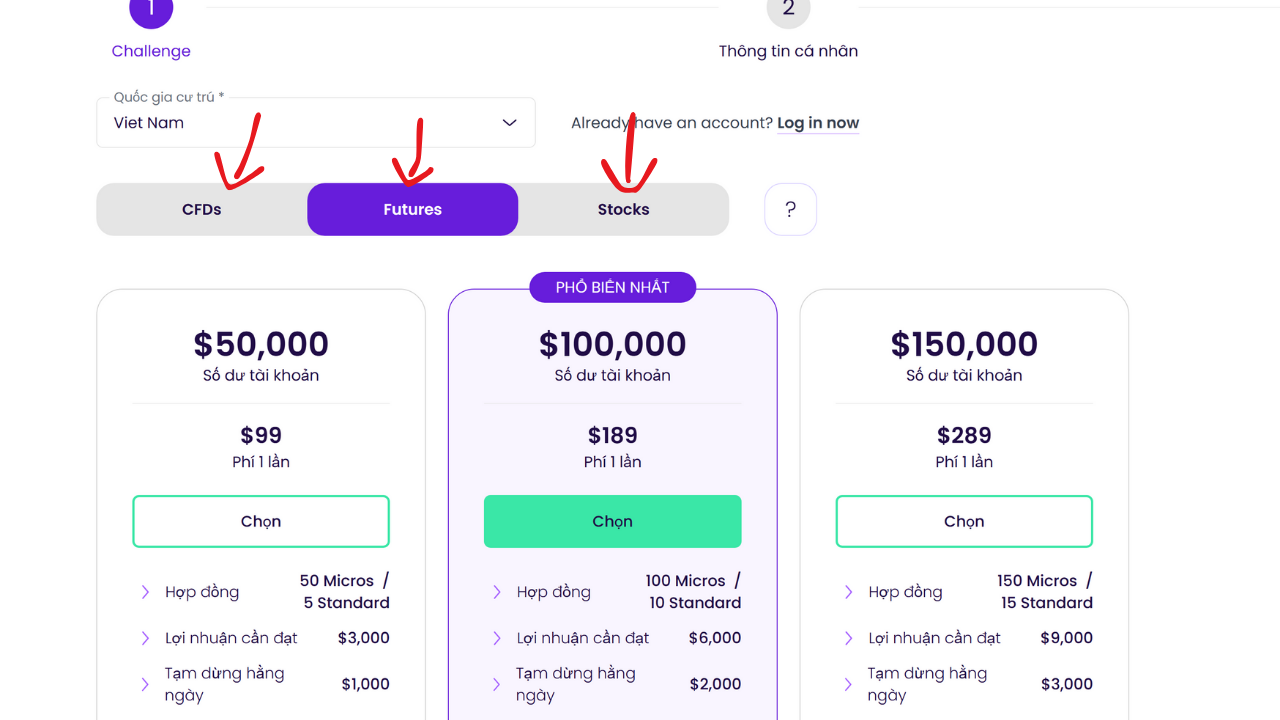 Bước 2 : Chọn gói Tài Khoản CFDs Prime 1 vòng , Prime 2 vòng và Size Gói bạn muốn thi