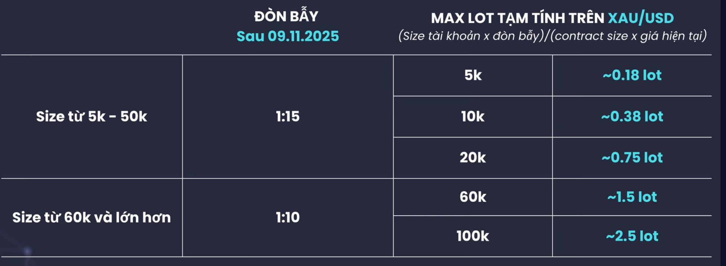 Tổng kết lại, mỗi quỹ prop trading đều có chính sách đòn bẩy và số lot tối đa khác nhau.